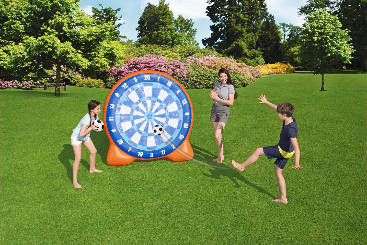 Bestway All Star Kickball Inflatable Dartboard är en uppblåsbar fotbollsdart som ger barn en rolig och interaktiv utomhusaktivitet. Denna darttavla låter små mästare spendera dagen utomhus med att sparka medföljande bollar mot det klibbiga målet och samla poäng.