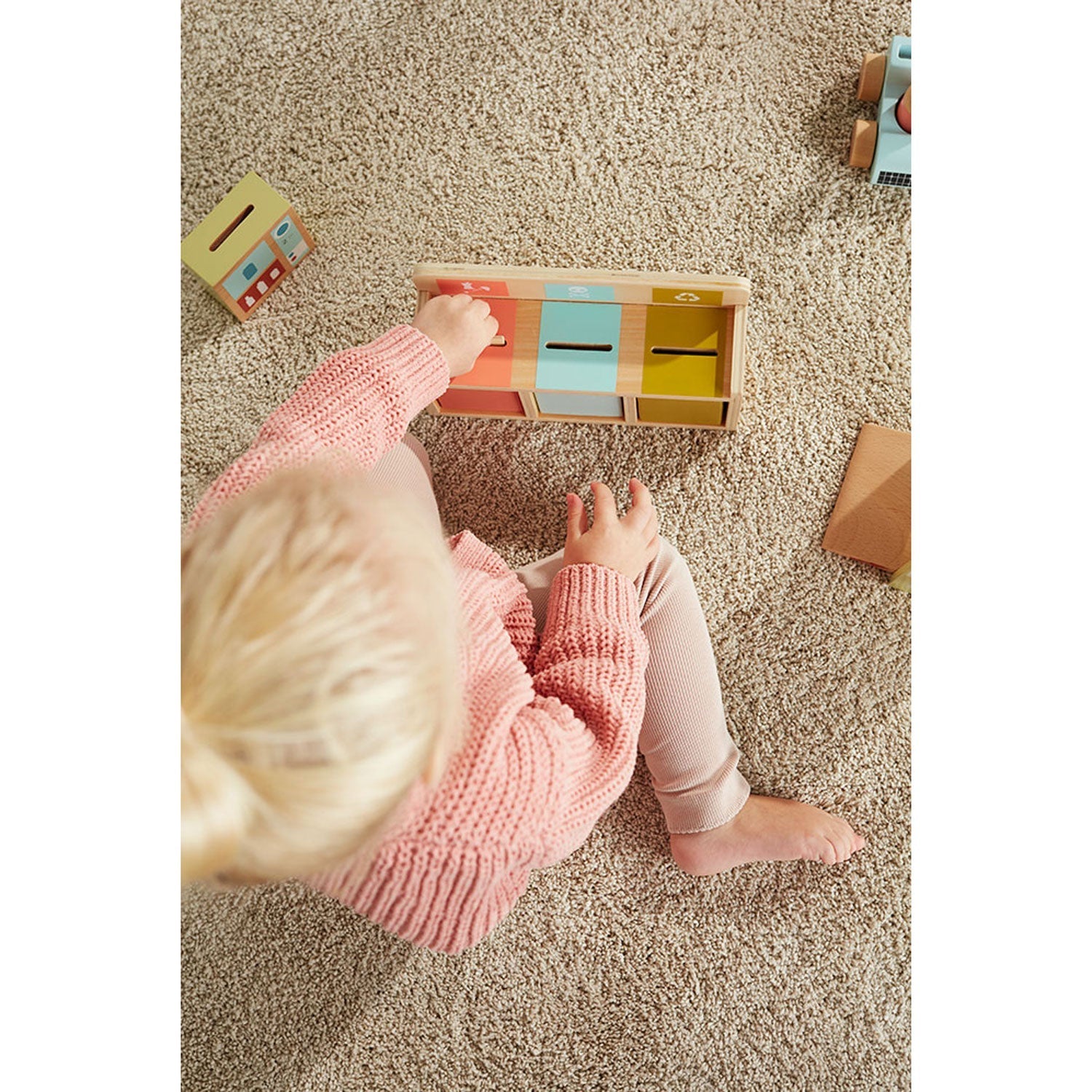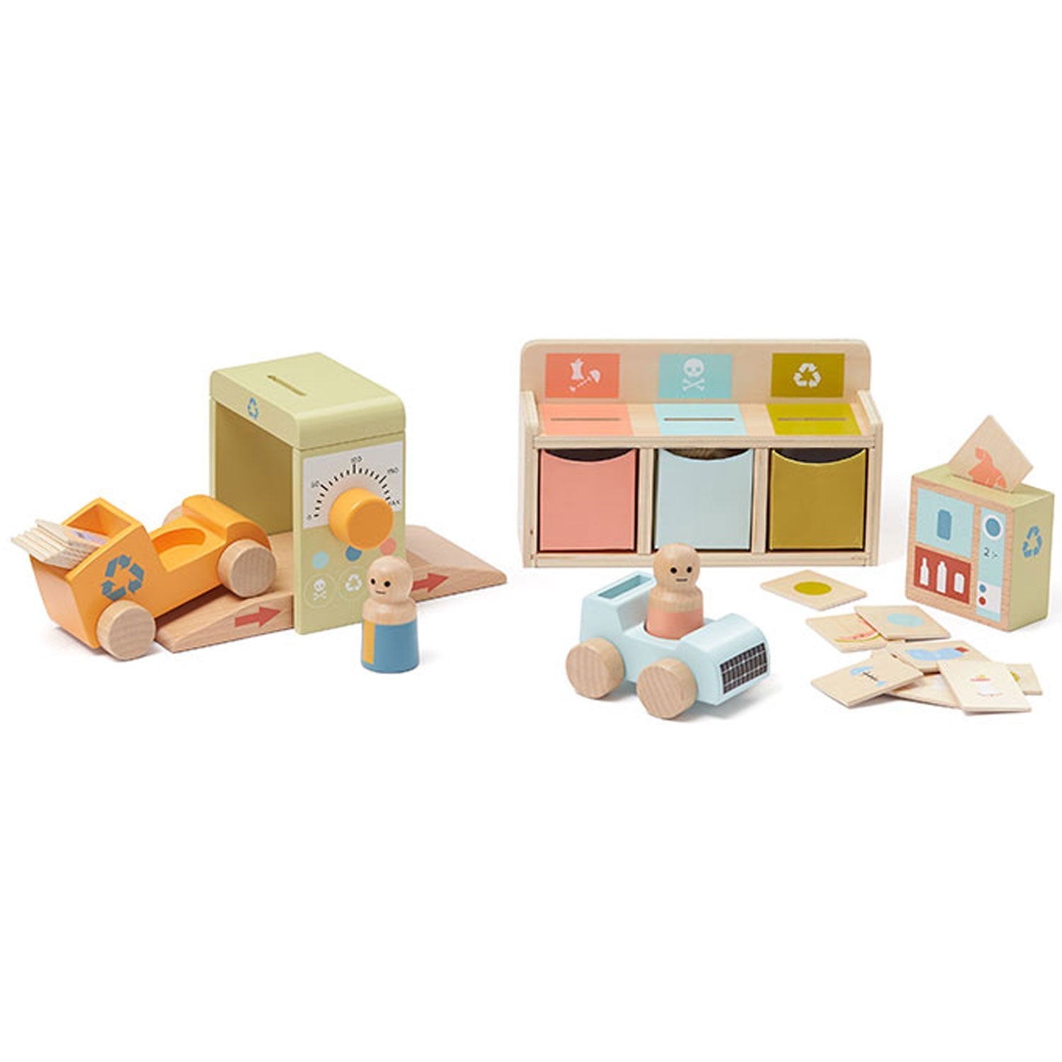 I den här kompletta leksaksuppsättningen ingår 17 träkort med illustrationer av olika avfallstyper, en återvinningslastbil med chaufför, en våg med klickljud, och en konsumentåtervinningsstation med tre olikfärgade kärl. Barnen kan lära sig sortera och placera korten i rätt behållare, vilket gör inlärningen både rolig och lärorik.